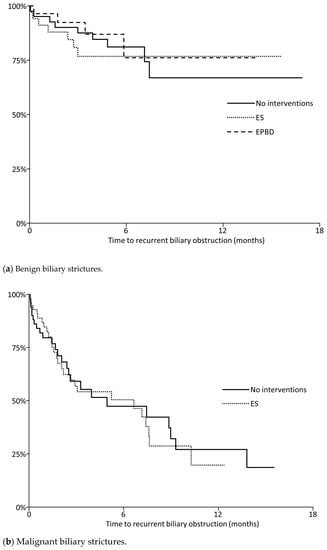 Kaplan-Meier curves of recurrent biliary obstruction according to the ampullary interventions in benign biliary strictures (a) and malignant biliary strictures (b). Solid line: No interventions, dotted line: ES (endoscopic sphincterotomy), Dashed line: EPBD (endoscopic papillary balloon dilation).