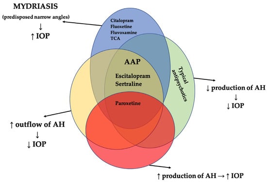 Schematic representation of the relationship between antidepressant and antipsychotic drugs and the various ocular side effects related to glaucoma pathogenic mechanisms. AAP, atypical antipsychotics; IOP, intraocular pressure; AH, aqueous humour; TCA, tricyclic antidepressants; ↑, increased; ↓, decreased.