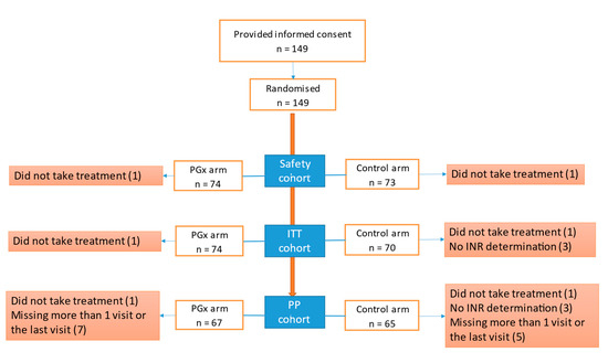A total of 128 patients reached at least 1 INR reading within the range in the first 6 weeks of treatment, 66 (89.2%) in the PGx group and 62 (88.6%) in the control group (p = 1.000). During the 3 months of treatment, 135 (93.8%) patients had at least 1 INR reading within the therapeutic range, 70 (94.6%) in the PGx group and 65 (92.9%) in the control group (p = 0.7402).