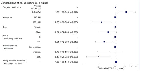 In univariate analysis, treatment with combination of HCQ and AZM and absence of pre-existing disorder were significantly associated with a higher proportion of patients discharged alive within 15 days after their admission (both p < 0.001) (Table S2).