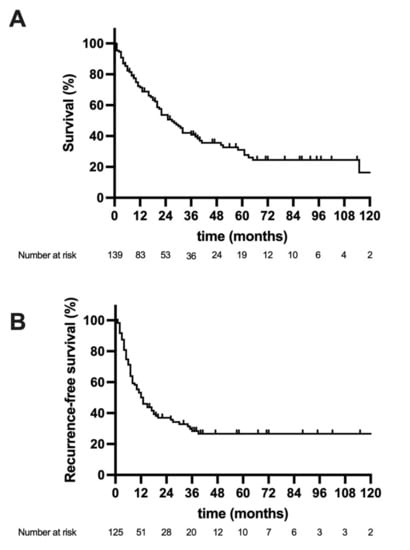 The median follow-up of the study cohort was 54 months and the overall number of deaths at 1, 3, and 5 years were 43 (31.2%), 74 (53.2%), and 81 (58.2%), respectively. The median OS of the whole cohort was 25 months (95% confidence interval (CI): 17–33), (3-year OS = 41%, 5-year OS = 31%), and the median RFS 12 months (95% CI: 8–16 (3-year RFS = 28%, 5-year CSS = 26%), Figure 1A,B). A Kaplan–Meier analysis with respect to radiologic risk stratification showed a mean OS of 142 months (95% CI: 107–178, 3-year OS = 78%, 5-year OS = 78%) in patients with a single nodule ≤3 cm, a median OS of 28 months (95% CI: 18–39, 3-year OS = 45%, 5-year OS = 33%) with a single nodule >3 cm, and a median OS of 19 months (95% CI: 10–28, 3-year OS = 18%, 5-year OS = 9%, p = 0.001 log rank) with ≥2 nodules (Figure 2G). Accordingly, the mean RFS was 144 months (95% CI: 110–179, 3-year RFS = 80%, 5-year OS = 80%) in patients with a single nodule ≤3 cm, a median RFS of 17 months (95% CI: 11–23, 3-year RFS = 30%, 5-year RFS = 27%) with a single nodule >3 cm, and a median RFS of 7 months (95% CI: 5–9, 3-year RFS = 0%, 5-year RFS = 0%, p = 0.001 log rank) with ≥2 nodules (Figure 2H). Further, a comparative analysis between patients surviving longer than the median OS and deceased patients was carried out (Appendix A Table A2)