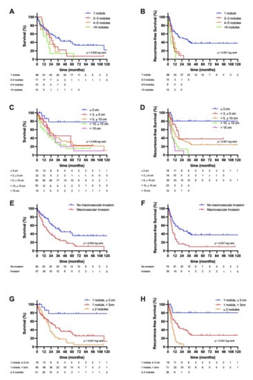 Other radiologic criteria e.g., number of nodules (OS: p = 0.005 log rank, RFS: p = 0.001 log rank), largest tumor diameter (OS: p = 0.006 log rank, RFS = 0.001 log rank), and macrovascular invasion (OS: p = 0.003 log rank, RFS: p = 0.001 log rank) were further associated with survival in the cohort. A more detailed analysis for radiologic criteria is provided in Figure 2.