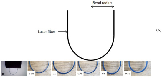 (A) Fiber bending radius, (B) Fiber bending radii tested.