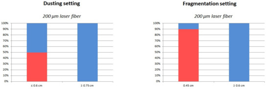 The current study found that small core fibers (200 µm) were prone to a higher rate of fracture and failed at a larger bend radius (≤0.6 cm) than 272 and 365 µm fibers in dusting setting (0.45 cm only). Surprisingly, no 200 µm fiber failure occurred at a bend radius ≥0.6 cm in fragmentation setting, but there was a higher proportion of fractures than in dusting setting (90% versus 50%, respectively). Thus, we found that small core fibers failed significantly more often than the 272 and 365 µm ones. These results are consistent with the report by Mues et al., and may be explained by the beam profile of the Ho:YAG laser [21]. Indeed, the Ho:YAG laser beam does not couple small core fibers (<200 µm), and the risk may be overfilling the fiber core and leak laser energy to the fiber cladding, which can damage the fiber [4,5,24,25]. Thus, the use of small core fibers require the funneling of laser beam. As consequence, Ho:YAG laser is typically limited to larger fiber diameters (270–500 μm).