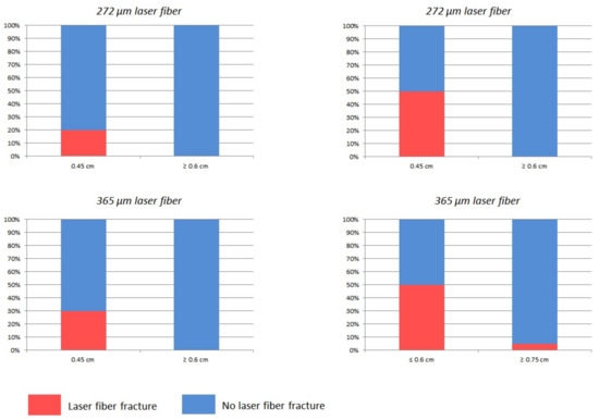 Of the 200 and 272 µm fibers, there was no fracture for a bend radius ≥0.6 cm. While 90% of the 200 µm fibers broke at a radius of 0.45 cm, 50% of the 272 µm did. The 365 µm fibers broke more frequently at ≤0.75 cm. A total of 5% and 50% of 365 µm laser fibers broke with a bending radius of ≥0.75 and ≤0.6 cm, respectively, Figure 2.