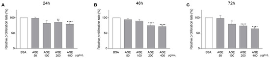 Rising concentrations of AGEs gradually reduce CASCs proliferation. CASCs were exposed to different AGEs concentrations (50, 100, 200, and 400 µg/mL). Proliferation was measured at different time points: 24 h ((A), n = 18), 48 h ((B), n = 18), and 72 h ((C), n = 21). Data are normalized to BSA and represented as mean ± SEM. * denotes p < 0.05, ** denotes p < 0.01, **** denotes p < 0.0001 vs. BSA.