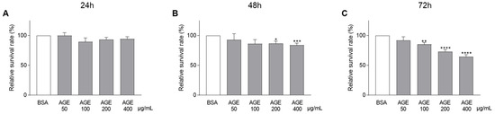 As shown in Figure 2, rising concentrations of AGEs negatively affected CASCs survival in time. Significant effects of AGEs were observed after 48 (Figure 2B) and 72 h (Figure 2C; 85% ± 3 in 100 µg/mL, 73% ± 3 in 200 µg/mL, and 64% ± 4 in 400 µg/mL AGEs). Application of BSA alone did not affect the survival capacity of CASCs (Figure S1).