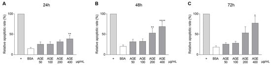 Rising AGEs concentrations increases CASCs apoptosis. CASCs were conditioned with BSA and rising concentrations of AGEs (50, 100, 200, and 400 µg/mL). The percentage of apoptosis was measured over time for 24 ((A), n = 6), 48 ((B), n = 8), and 72 h ((C), n = 7). Data are normalized to the positive control (+, X-VIVO 0% FCS, 2% P/S) and shown as mean ± SEM. * denotes p < 0.05, ** denotes p < 0.01, **** denotes p < 0.0001 vs. BSA.