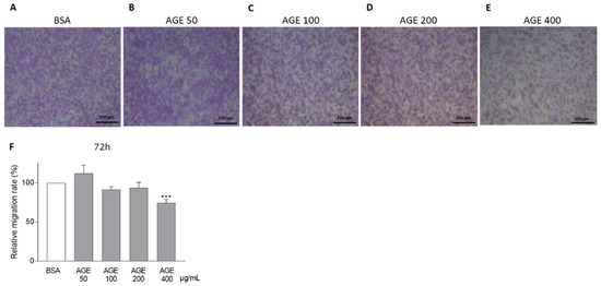 CASCs migration capacity was evaluated with a transwell migration assay after 72 h of incubation with different concentrations of AGEs. In Figure 4A–E, representative examples of CASCs migration after incubation with BSA and different AGEs concentrations (50, 100, 200, and 400 µg/mL) are presented. Quantification of migration is shown in Figure 4F. Compared to BSA, a significant reduction in migration was observed when CASCs were incubated with 400 µg/mL AGEs (Figure 4E,F; 75% ± 5 in 400 µg/mL AGEs).