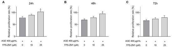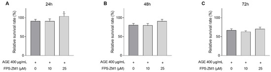 Survival (Figure 6A–C) was evaluated after 24 (A), 48 (B), and 72 (C) h. The negative impact on CASCs survival by AGEs (Figure 2) is significantly improved after pre-incubation with 25 µM FPS-ZM1 (Figure 6A–C). After 24 h, survival significantly improved (Figure 6A; 104% ± 7 in 25 µM FPS-ZM1 vs. 91% ± 4 in 400 µg/mL AGEs). This trend was also observed after 48 h (Figure 6B; 91% ± 5 in 25 µM FPS-ZM1 vs. 81% ± 5 in 400 µg/mL AGEs, p = 0.07).