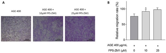Representative examples of CASCs migration after 72 h incubation with 400 µg/mL AGEs and FPS-ZM1 are presented in Figure 7A and quantified in Figure 7B. CASCs pre-incubation with 25 µM FPS-ZM1 could prevent the decreased CASCs migration capacity observed with AGEs exposure (Figure 7B; 98% ± 6 in 25 µM FPS-ZM1 vs. 77% ± 8 in 400 µg/mL AGEs, p = 0.07).