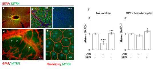 MTRN immunostaining on rat flat-mounted retina and RPE regulation in the retina and RPE/choroid complex at 24 h after MR agonist and antagonist intravitreous administration. MTRN immunostaining on the flat-mount retina (a–d). MTRN (green) is concentrated around the optic nerve head (a), also expressed in ganglion cell layer (GCL) (b), and at the outer limiting membrane (OLM). GFAP staining represents astrocytes located around vessels in the inner retina (b,d). MTRN is secreted around vessels at the endfeet of astrocytes (d, arrows). In RPE cells delimited by phalloidin staining, MTRN is expressed in the cytoplasm but also in the nuclei (e). Quantitative analysis of MTRN expression in neuroretina and RPE-choroid complex 24 hrs after aldosterone (100 nM) or spironolactone (10 µM) in vivo exposure (f). Significant reduction of Mtrn expression is observed in neural retina at 24 h after aldosterone injection (p < 0.001). Spironolactone up-regulated Mtrn compare to aldosterone, but not compared to vehicle. There is significant up-regulation of Mtrn expression exclusively in RPE/choroid at 24 h after spironolactone injection # (p < 0.05 as compared to Aldo), *** (p < 0.01 as compared to untreated controls), ### (p < 0.001, as compared to Aldo treatment).