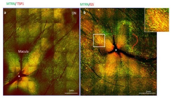 3.2. MTRN Is Concentrated in the Macula and Co-Localized with Thrombospondin in Non-Human Primate