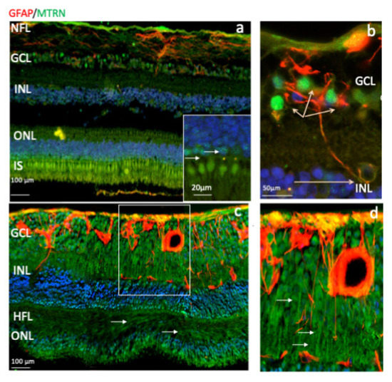 Human immunostaining of MTRN and GFAP on retinal cryosection. Immunostaining on human retinal cryosection of MTRN (green), GFAP (red), outside the macula (a,b), and in posterior retina (c,d). MTRN localized in the nerve fiber layer (NFL) (a), in Henle fiber layer (HFL) (c), in and around astrocytes, in the nuclei of ganglion cells layer (GCL), in some of the nuclei of the inner and outer nuclear layer (INL, ONL) (a,c), particularly in granules in the cone nuclei, and in the inner segments of photoreceptors (IS) (a and inset). MTRN is colocalized with GFAP in astrocytes and around the vessel (b,d).