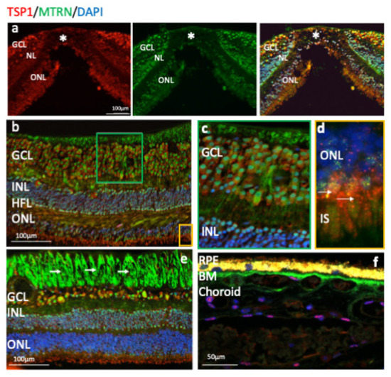 Outside of the macula, MTRN is found in the nerve fiber layer (NFL), in and around astrocytes, in the nuclei of ganglion cells in the ganglion cell layer (GCL), in some of the nuclei of the outer nuclear layer (ONL), particularly in granules of the cone nuclei (Figure 3a, inset, arrows), and in the inner segments of photoreceptors (IS). MTRN is present in astrocytes around vessels and diffuses at the surface of the retina (Figure 3b). In the posterior retina, MTRN is localized in astrocytes, in the deepest nuclei of the inner nuclear layer (Figure 3c,d), and in the extensions of glial Müller cells of the Henle fiber layer (Figure 3c, HFL, arrows). Co-labeling of MTRN with TSP1 shows co-localization of both proteins in the macula (Figure 4a), in both cytoplasm and nuclei of ganglion cells, and mostly in nuclei of inner and outer nuclear layers (Figure 4a). In addition, secreted MTRN is observed in all retinal layers. In the macula (Figure 4b–d), MTRN co-localize with TSP1 in all layers and is present along retinal glial Müller cells (Figure 4c). In the photoreceptors, MTRN and TSP1 co-localize in cone nuclei, within nuclear bodies (Figure 4d). MTRN signal is also very strong in the nerve fibers (Figure 4e, arrows). Note that in the outer nuclear layer (which represents the nuclei of photoreceptors), MTRN expression is more intense in the macula (Figure 4b) than outside of the macula (Figure 4e). Interestingly, we observed that in human retina, MTRN is abundant in the Bruch’s membrane (BM) (Figure 4f), with a gradient towards the choroidal vessels, where TSP1 and MTRN co-localize in some nuclei of the endothelial cells.