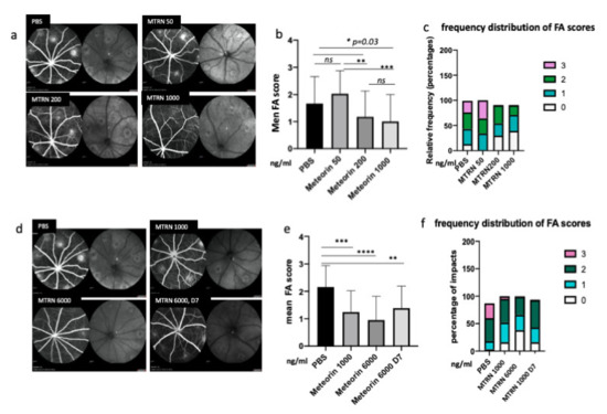 MTRN effect of CNV angiographic scores at day 14. Examples of fluorescein angiographic images at the left and infrared at the right of each eye fundus image with different tested doses (a, d). Mean grading scores and frequency of scores distribution in the preventive dose-response experiment (b,c) and in the preventive vs. curative dose experiment (c,f). MTRN: meteorin, 50 ng/mL, 200 ng/mL, 1000 ng/and 6000 mL (ng/mL), D7: treatment at day 7. Treatment. * (p = 0.03), ** (p < 0.01), *** (p < 0.001), **** (p < 0.0001).