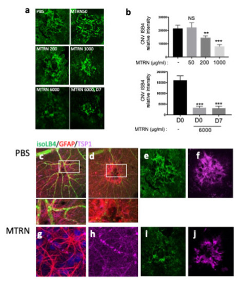 At preventive doses, MTRN reduced the angiographic leakage scores in a dose dependent manner with a significant reduction from 1 µg/mL (5 µL corresponding to a final concentration of 1 ng/µL in the vitreous), although a reduction of the 3 grading score frequency was already observed with the lower dose of 200 ng/mL (0.2 µg/mL final vitreous concentration). When administered at day 7, when CNV has already begin to form, MTRN was still efficient, although at a higher dose (6 ng/µL final vitreous concentration) (Figure 6). Reduction of CNV was further confirmed by quantification of neovascular membrane surface on flat-mounted choroids (Figure 7a), showing a 62% reduction in the preventive MTRN 1000 group and a 31% CNV reduction in the MTRN 200 group. When MTRN was administered at high dose (MTRN 6000 group), 80% of CNV reduction was observed, whether at a curative or preventive dose (Figure 7b). MTRN significantly reduced CNV when administered at the time of laser burn for the 200, 1000, and 6000 doses and when administered at the highest dose at day 7 (p < 0.01 for the 200 dose and <0.001 for other doses). At the level of the laser burn, on the neural retina, GFAP activation could be detected either in the superficial (Figure 7c, inset) or in the deep layers (Figure 7d inset), associated with TSP1 diffusion around the activated glial cells in eyes treated with PBS. Intense TSP1 staining was also observed at the level of CNV (Figure 7f). In the MTRN 1000 treated eye, high TSP1 signal could be observed at the endfeet of astrocytes on the vessel (Figure 7g,h) and despite the reduced size of CNV, TSP1 signal appears larger than the CNV (Figure 7i,j). Altogether, these results show that MTRN has an anti-angiogenic effect on CNV and that this effect could be mediated, at least in part, through TSP1.