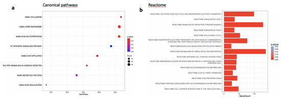 Transcriptomic analysis of the neural retina at day 7 after MTRN (1 µg/mL) was administered at the time of laser delivery. (a) Enriched term plot from canonical pathways gene sets from pathway databases. The dot plot depicts the gene ratios (number of core genes over the total number of genes in the set). The dots are colored by the adjusted p-value and their size is proportional with the size of the gene set (b), Reactome-enriched term plots from Reactome gene sets. The dot plot depicts the gene ratios (number of core genes over the total number of genes in the set). The dots are colored by the adjusted p-value and their size is proportional with the size of the gene set.