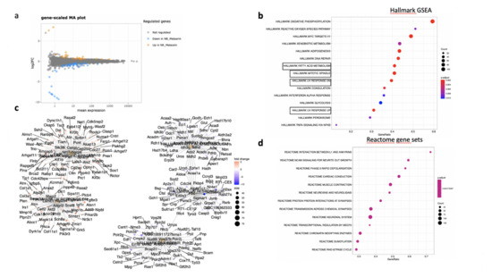 In the neural retina, 22 genes were significantly down- and 10 genes were up-regulated (DESeq2, log2FC > 1, p < 0.05). A full list of regulated genes is available in Supplementary Table S2. The gene-scaled MA plot showed homogenous regulations of highly and poorly expressed genes (Figure 8a). GSEA, using the Hallmark gene sets (Figure 10b), identified TNFA signaling via NFKB, several pathways involved in oxidative stress such as peroxisome (all genes are down-regulated), reactive oxygen species (all genes down-regulated), UV-response down (all genes up), UV-response up (all genes down-regulated), DNA repair (all genes down-regulated) (Figure 10c), indicating reduction of oxidative stress markers in MTRN-treated retina. Additional regulated pathways were coagulation (all genes down-regulated including Mmp3, Timp1, Clu, Sparc, S100a1, Thbd, and others), oxidative phosphorylation (all down-regulated), and mitotic spindle (all up-regulated including Cdc42, Rock1, and 2). These regulated pathways indicate that MTRN reduces oxidative stress, activates microtubules formation and organization, and acts on fatty acid and mitochondria metabolism.