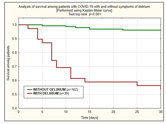 A survival probability assessment in delirious and non-delirious COVID-19 patients was performed using the Kaplan-Meier curve (Figure 1). It presents a statistically significant difference in 30-day survival between both groups in favor of patients without delirium (p < 0.001).