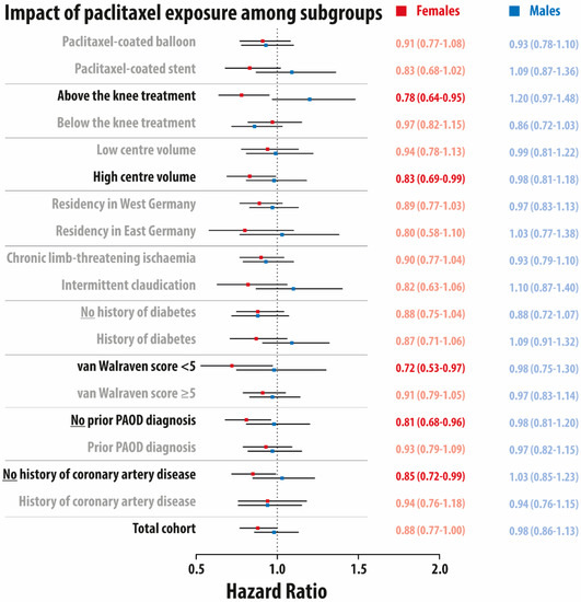 The primary outcome was a 5-year, all-cause mortality with the end of the follow-up in December 2019. Follow-up times longer than five years were censored to ensure robust estimations. There was no exclusion of patients with a shorter follow-up. Cox proportional hazard regression models were utilized to estimate the impact of paclitaxel exposure mortality for the total cohort and the subgroups of paclitaxel-coated device type (balloon vs. stent), affected level (above vs. below the knee), hospital volume (low vs. high), patient residence (West vs. East Germany), Fontaine stage (CLTI vs. IC), history of diabetes (no vs. yes), van Walraven score (<5 vs. ≥5), prior PAOD diagnosis (no vs. yes), and history of coronary artery disease (no vs. yes). Each model was estimated separately for the total cohort and each subgroup was adjusted for all baseline variables, resulting in point estimates of the hazard ratio (HR) of the impact of paclitaxel exposure on 5-year, all-cause mortality with 95% confidence intervals. An interaction of each binary subgroup variable and binary paclitaxel exposure was entered into each model to compute separate confidence intervals for both subgroups. If the confidence intervals of females and males were non-overlapping, we tested sex differences using the three-way interactions of sex, paclitaxel, and the variable of interest. The proportional hazards assumption was checked using graphical diagnostics based on Schoenfeld residuals, and the test suggested by Grambsch and Therneau [27]. This is an explanatory analysis not adjusting for multiple testing.