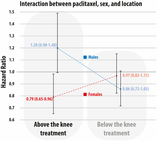 Interaction between paclitaxel exposure (yes vs. no), sex (female vs. male), and level (above-the-knee treatment vs. below-the-knee treatment). Hazard ratio and 95% confidence interval are in red for females and in blue for males.
