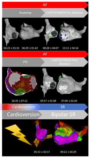 Representative example of our CARTOFINDER workflow (focal activity, green color; rotational activity, blue color) in patients with persistent atrial fibrillation (AF, atrial fibrillation; PVI, pulmonary vein isolation; SR, sinus rhythm). The mean time for each workflow-step is visualized in minutes ± standard deviation.