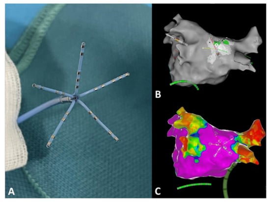 CARTOFINDER-guided mapping for regions of interest (ROI) was conducted automatically, utilizing the multipolar PentaRay catheter. (A) Photographic representation of the PentaRay catheter with its five splines. (B) Representative example for CARTOFINDER-guided mapping for ROIs at the posterior left atrial wall, using the PentaRay mapping catheter. (C) Bipolar high-density mapping of the left atrium (B,C) posterior–anterior view.