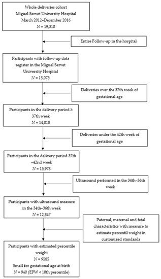 This was a retrospective cohort study of births assisted at the Miguel Servet University Hospital (MSUH), between March 2012 and December 2016. The inclusion criteria were as follows: live singleton pregnancies controlled in MSUH from the first trimester of gestation; fetal ultrasound assessment at gestational age of 35 (range 34–36) weeks; and deliveries between 37 and 42 weeks of gestational age of fetuses without stillbirth associated with malformations or chromosomal abnormalities. Of the 19,310 consecutive deliveries assisted in our hospital in the period studied, the 9585 cases that fulfilled the specific inclusion criteria—such as data availability to estimate percentile weights by standards—were considered for the analysis. Study participants’ selection samples are detailed in Figure 1.