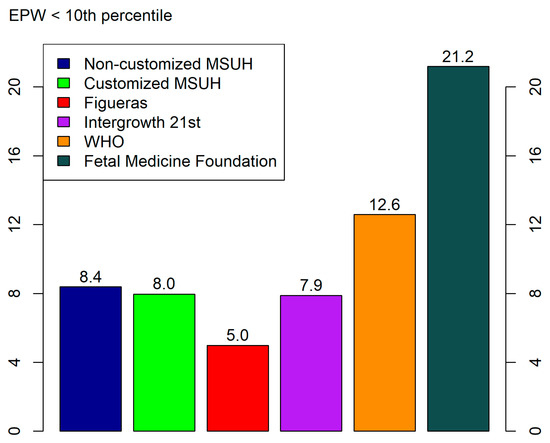 Several studies customized or not to maternal and fetal physiological variables have been proposed to predict SGA [14]; these fetal growth standards [15,16,17] are based on Hadlock et al.’s methodology [18,19], or on new multilevel models [20,21,22], and can be customized to maternal and fetal physiological variables [23]. The estimation of the percentile adjusted for maternal and fetal characteristics is the property that postulates customized standards as better detectors of adverse perinatal outcomes than population-based standards (non-customized (NC)) [24]. The Royal College of Obstetricians and Gynecologists (RCOG) [25] recommends the use of customized birthweight curves to identify SGA fetuses; the adjustment of fetal weight should be performed individually, and not by population—although some studies have questioned the superiority of the EPW by customized standards and its association with APOs [26,27], and SGA with APOs [28].