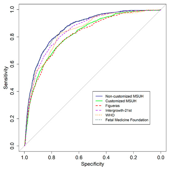 p-values of the comparisons of the standard AUC values and sensitivity for a 90% specificity are shown in Table 4. The Fetal Medicine Foundation and the non-customized MSUH standards showed no statistically significant differences between them, with greater SGA prediction ability than the Intergrowth-21st, Figueras, and WHO standards. Moreover, in the comparison, the Intergrowth-21st and WHO standards showed significant differences from the customized MSHU and Figueras standards. Finally, customized standards did not show differences between them.