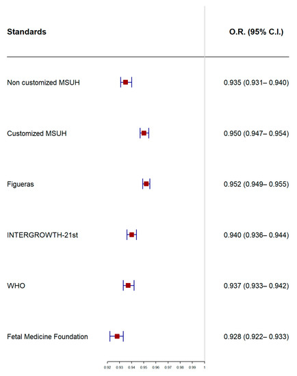 Figure 3 illustrates the receiver operating characteristic curve comparison and AUC for the prediction of SGA at delivery by ultrasound at 35 weeks. Figure 4 displays the results of the logistic regression model with the ORs and 95% CIs to predict SGA by ultrasound at 35 weeks, according to the standards.
