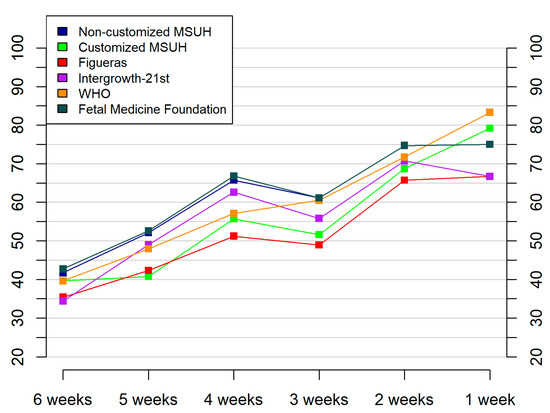 Reboul et al., in 2017 [49], found that the Hadlock and the customized Gardosi standards had a moderate predictive capacity for SGA at delivery (0.768 and 0.708, respectively), with the detection rates somewhat higher for the Hadlock standard, although with an average of performing ultrasound at 32 weeks—lower than ours, which could justify the lower predictive capacity.