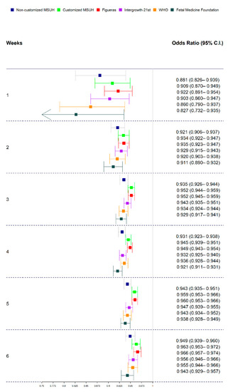 Figure 6 displays odds ratios and 95% confidence intervals of the standards in order to predict SGAs by ultrasound–delivery interval (range 1–6 weeks). Figure 7 illustrates the receiver operating characteristic curve comparison of fetal growth standards for the prediction of SGA newborns according to the ultrasound–delivery interval (range 1–6 weeks).