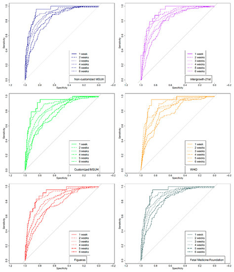 Table 5 displays values of AUCs and sensitivities for different FPRs to predict SGA by ultrasound–delivery interval (range 1–6 weeks). The observed results show higher detection rates as the interval decreases. Figure 5 shows the prediction of small for gestational age cases, by standard, by ultrasound–delivery interval (1–6 weeks), for a 10% false positive rate.