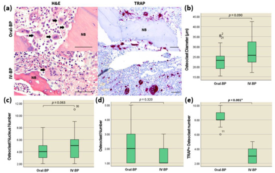 (a) High-magnification images (800×) of H&E (left) and TRAP (right) staining exhibiting round-shaped, multinucleated, giant osteoclasts (black arrows) at the necrotic jaw bone samples retrieved from IV-BP and oral-BP induced MRONJ subjects. Scale bars = 50 μm. Statistical analysis of the mean osteoclast diameter (b), number of nuclei (c), total osteoclast number (d), and TRAP-positive osteoclasts (e) in the necrotic bone specimen from (a), via the Mann–Whitney U test (n = 20 per group). ° marks statistical outliers. For detailed data, see Table 2. NB, necrotic bone; BP, bisphosphonates; IV, intravenous. * p < 0.001.