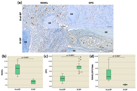 We also sought to evaluate the changes in the bone turnover of MRONJ patients after IV and oral bisphosphonate treatment at cellular and molecular levels. To achieve this, the differences in the immunohistochemical reactivity for RANKL and OPG were compared between the two groups. The expression of RANKL (Figure 2a,b, representative images are shown) was significantly decreased in the bones of IV-BP patients compared with the oral-BP patients (p < 0.001), whereas a higher number of OPG-positive cells (Figure 2a,c, representative images are shown) was indicated among the former group (p < 0.001). Consequently, the RANKL/OPG ratio (Figure 2d) was markedly decreased in the histologic specimens of MRONJ patients with a history of IV BP administration compared with that of the respective oral-BP subjects (Table 2, p < 0.001). These findings suggested that IV BPs could downregulate the RANKL/OPG ratio to a significantly higher level than that induced via oral BPs, indicating that the relative deficiency of the RANKL/OPG ratio in patients taking intravenous BPs may potentially lead to the development of advanced stages of MRONJ.