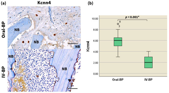 To investigate the regulation of calcium-activated potassium ion channels associated with osteoclast differentiation following IV and oral BP treatment, we examined the protein expression levels of Kcnn4. Immunohistochemistry demonstrated the presence of Kcnn4-positive cells in both groups, as characterized by the brown staining predominantly localized in the nucleus and cytoplasm. The level of Kcnn4 was revealed to be significantly downregulated in the tissues of IV-BP subjects compared with the oral-BP group counterparts (Figure 3, Table 2, p < 0.001). Taken together, these data suggest that the suppressed osteoclastogenic activity observed among IV-BP patients may also be related to the significant inhibition of KCa3.1 currents that are essential for RANKL-induced Ca2+ responses.