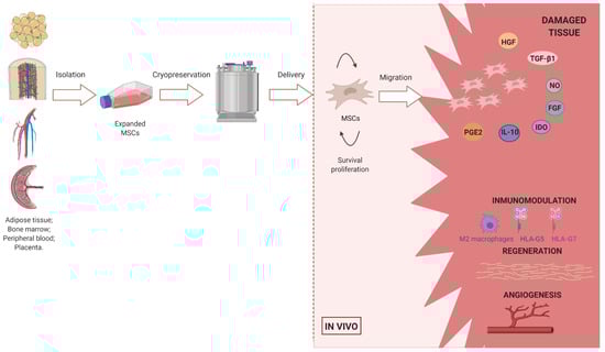 This scheme summarizes the entire MSC manufacturing process for allogeneic cellular therapy and its subsequent function in the recipient tissue. The secretion of cytokines and other factors such as NO, IDO, HGF, FGF, IL-10, PGE2 and TGF-β1 contribute to the tissue repair processes that can be summarized in three points: (1) Immunomodulation; (2) Regeneration; and (3) Angiogenesis. Created with BioRender.com.