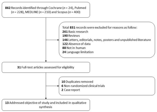 The literature search strategy identified 862 references. After screening the title and abstract and removing the articles which fulfilled the exclusion criteria (Figure 2), 31 records underwent full-text review. After the full-text review, duplicates, non-randomized clinical trials and case reports were excluded. Finally, 13 records with a total sample size of 555 participants met the eligibility criteria.
