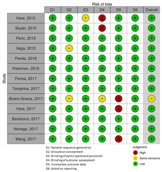 Quality assessment of the included studies. The risk-of-bias summary is based on the review authors’ judgements about each risk-of-bias item for each individual study: The green circle indicates low risk, and the red circle indicates high risk. Some concerns risk is represented by the yellow circle.