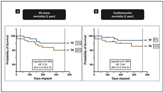All-cause and cardiovascular mortality at one year. The percentage value on the right axis corresponds to the mortality rate. (A) All-cause mortality comparing TF and TA TAVR. (B) Cardiovascular mortality comparing TF and TA TAVR.