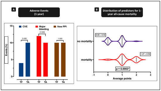 After one year, cerebrovascular events (TF vs. TA: 4.0% vs. 10.0%; p = 0.436) were also numerically enhanced in the TA cohort. Major bleeding during one-year follow-up (TF vs. TA: 12.0% vs. 10.0%; p > 0.999) was comparable in both cohorts. Interestingly, the need for permanent pacemaker implantation (PPI; TF vs. TA: 10.0% vs. 10.0%; p = 1.000) was the same in both cohorts (Figure 2A). The functional improvement as assessed by NYHA stage during one-year follow-up was similar in TF and TA patients (Supplementary Figure S2).