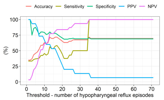 Demographic parameters are expressed as the median and interquartile range (IQR), the absolute frequency, or the relative frequency (%). The significance of differences between groups was tested with the Mann–Whitney test or the chi-square test of independence for contingency tables. According to a study by Hoppo et al., the LPR diagnosis was first based on the occurrence of ≥1 hypopharyngeal reflux episode detected with MII-pH [7]. The diagnostic accuracies of the Peptest, RSI, and RFS were evaluated in terms of the accuracy, sensitivity, specificity, positive predictive value (PPV), and negative predictive value (NPV) with corresponding confidence intervals. Then, to evaluate the diagnostic value of the Peptest with more restrictive criteria, we performed the same calculations for the Peptest, RSI, and RFS, but the diagnosis was based on a threshold of six hypopharyngeal reflux episodes detected with MII-pH monitoring. This latter threshold was based on a previous study by Formánek et al. [9]. Moreover, we calculated the evolution of the accuracy, sensitivity, specificity, PPV, and NPV of the Peptest over a span of thresholds that ranged from 1 to 70 hypopharyngeal reflux episodes. Finally, the diagnostic value of the Peptest in diagnosing GERD was determined based on the threshold for the DeMeester score. The significance level was set to 0.05, and the statistical analysis was performed using R software, version 4.0.3 (R foundation, Vienna, Austria).