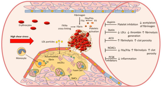 The initiation of an atherosclerotic lesion is associated with retention of low-density lipoproteins (LDL) and their oxidation (oxLDLs). oxLDLs stimulate recruitment of blood monocytes and their differentiation into macrophages. An uptake of oxLDLs by macrophages results in the formation of foam cells. Upon stimulation, vascular smooth muscle cells (SMCs) migrate and proliferate. Tissue factor (TF), expressed on macrophages and SMCs, is involved in coagulation activation, resulting in prothrombin (factor II, FII) conversion to thrombin (FIIa), which, in a prothrombinase complex with active FV (FVa), converts fibrinogen to fibrin. Several drugs, including aspirin, statins, angiotensin-converting enzyme inhibitors (ACEI), or non-vitamin K antagonist oral anticoagulants (NOACs) have been shown to modulate fibrin clot phenotype by different mechanisms. Proprotein convertase subtilisin kexin (PCSK) type 9 inhibitors are able to attenuate interplaque inflammation, but their effect on fibrin clot properties has not been reported yet. ↑—up-regulation, ↓—down-regulation.
