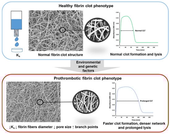 Several parameters have been used in human subjects to assess fibrin clot properties. The structure of a fibrin clot generated from plasma (or purified fibrinogen) can be described using clot permeability (Ks or Darcy’s constant; reflecting volume of a buffer flowing through a fibrin gel during prespecified time) [37,38,39], turbidity (clot absorbance measured using a spectrophotometer at 405 or 340 nm) [40], or the direct measurement of fibrin fiber diameter, pore size, or fiber branching using microscopic techniques [41]. Fibrin clot susceptibility to lysis is measured by turbidimetry using several assays with either exogenous tissue plasminogen activator or plasmin added to clotted plasma [40,42,43]. A so-called prothrombotic fibrin clot phenotype encompasses reduced Ks associated with typical changes in fibrin structure, such as lower fibrin fibers diameter, lower pore size area between particular fibers, and an increased number of branch points, along with faster fibrin formation and prolonged lysis time (Figure 2).