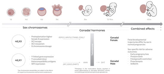 Sex differences exist throughout the life course, with the earliest differences evident well before birth and spanning gestation. Pregnancies carrying male and female fetuses may differ in their risks of early pregnancy loss, preterm birth, and placental insufficiency associated with preeclampsia and/or fetal growth restriction. However, establishing the influence of sex on these outcomes is complicated by the different diagnostic criteria and genetic and environmental risk factors in the populations studied. As the placenta mediates fetal growth and underlies many pregnancy complications, sex differences arising in gestation are likely due to effects of sex on placental development and function. Compared to females (XX), male (XY) fetuses are larger by the second trimester of pregnancy (based on ultrasound data) [,], show a more pro-inflammatory immune response across gestation, and are at a higher risk of infection leading to preterm birth and other pregnancy complications [,,]. This in turn may contribute to sex differences in early susceptibility to childhood conditions including neurodevelopmental disorders [,,]. Throughout life, females remain at lower risk of infection, but are more likely than males to develop adult-onset autoimmune diseases []. Sex differences extend well beyond steroid hormones, reproductive organs, and body size; sex differences also affect factors such as disease incidence, and are of value to consider with respect to diagnostic criteria and therapeutic efficacy [].