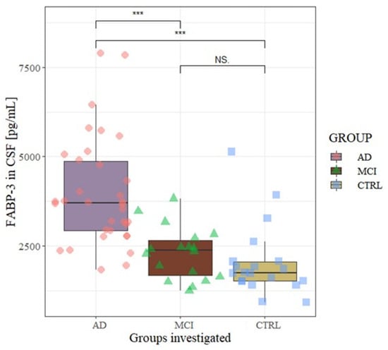 CSF levels of FABP3 in the analyzed groups. Level of statistically significant *** p < 0.001, NS—no significant. AD—Alzheimer’s Disease, MCI—mild cognitive impairment, CTRL—control, CSF—Cerebrospinal fluid.