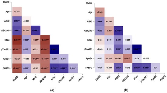 The associations between levels of FABP3, ApoE4 and neurochemical biomarkers were performed using the Spearman rank correlation test. In the whole study group (AD + MCI + CTRL) significant positive correlations between CSF levels of FABP3 and age (rho = 0.332, p = 0.002), Tau (rho = 0.723, p < 0.001), pTau181 (rho = 0.693, p < 0.001) and negative with: MMSE (rho = −0.585, p < 0.001), Aβ42/40 ratio (rho = −0.488, p < 0.001), ApoE4 (rho = 0.318, p = 0.007) (Figure 2a) were observed. In the same study group the levels of ApoE4 positively correlated with Tau (rho = 0.299, p = 0.012), pTau181 (rho = 0.265, p = 0.026) and negatively with MMSE (rho = −0.272, p = 0.023), Aβ42 (rho = −0.426, p < 0.001), as well as Aβ42/40 ratio (rho = −0.472, p < 0.001) (Figure 2a). Not observed associations between levels of FABP3 and ApoE4 in any AD and MCI compared group.
