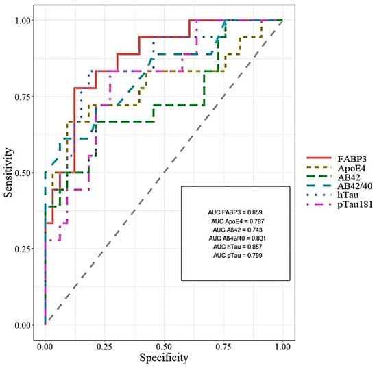 Analysis of ROC showed that CSF levels of FABP3 may significantly discriminate AD patients from controls (AUC = 0.881, p < 0.001), with 84.6% of accuracy, 88.2% specificity and 77.8% sensitivity. The ApoE4 concentration in CSF may significantly differentiate AD patients from controls (AUC = 0.751, p = 0.001), with 68% of accuracy, 80% specificity and 61.8% sensitivity.